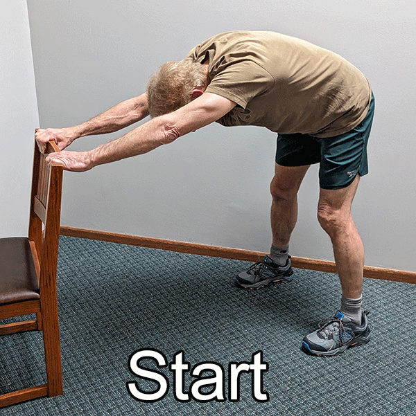 This exerciser has knee and pelvic pain related to chronically tight hamstring muscles. Stretching his legs in the back is difficult with great stiffness. Holding the back of a chair he bends over so that his back is as near parallel to the floor as possible while his feet are far from the chair. The legs are at about shoulder width apart with the elbows fully extended. Throughout the exercise the knees are kept unbent. After a few seconds he begins a series of small steps, in relative rapid succession, whereby he bends his elbows and moves his feet closer to the chair without changing the position of his torso. When he reaches maximal hamstring stretch he rocks back on his heels 10 times. Next, he reverses these “baby steps”, again in rapid succession. The exercise is repeated to 5 sets with a brief rest between each set. It can be done as often as needed.